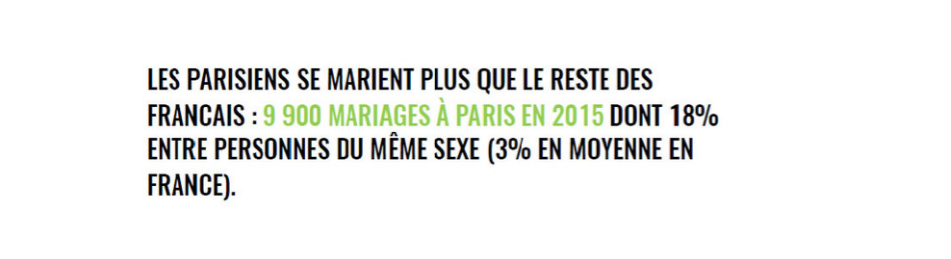 Notre capitale n'a jamais aussi bien porté son surnom. On y célèbre davantage de mariages que dans le reste du pays, avec en moyenne 4,5 mariages par jour (contre 3,5 dans le reste de la France). Et le divorce n'est pas plus fort qu'ailleurs, puisque pour deux mariages on compte une séparation. Les Parisiens aiment leur ville : 80% d'entre eux sont fiers à l'idée d'être Parisiens. Preuve de cet amour indéfectible : 11% seulement d'entre eux partiraient hors de Paris pour le week-end.