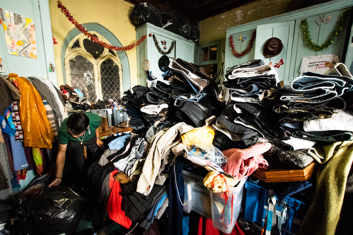 10h. Cinq personnes à la fois grimpent l’escalier escarpé de l’église, puis chacune s’assied sur une chaise. Le nombre de vêtements disponibles a déjà diminué, les bénévoles ne savent pas s’il en restera assez pour en distribuer tout le week-end. Avec le froid qui arrive, ils attendent 200 migrants en deux jours. À chacun, ils présentent plusieurs manteaux, des t-shirts, des paires de chaussures chaudes, des bonnets, des pulls… et proposent de choisir un exemplaire de chaque catégorie. Pas plus. Il faut s’assurer de passer l’hiver au chaud, mais il en faut aussi pour tout le monde.