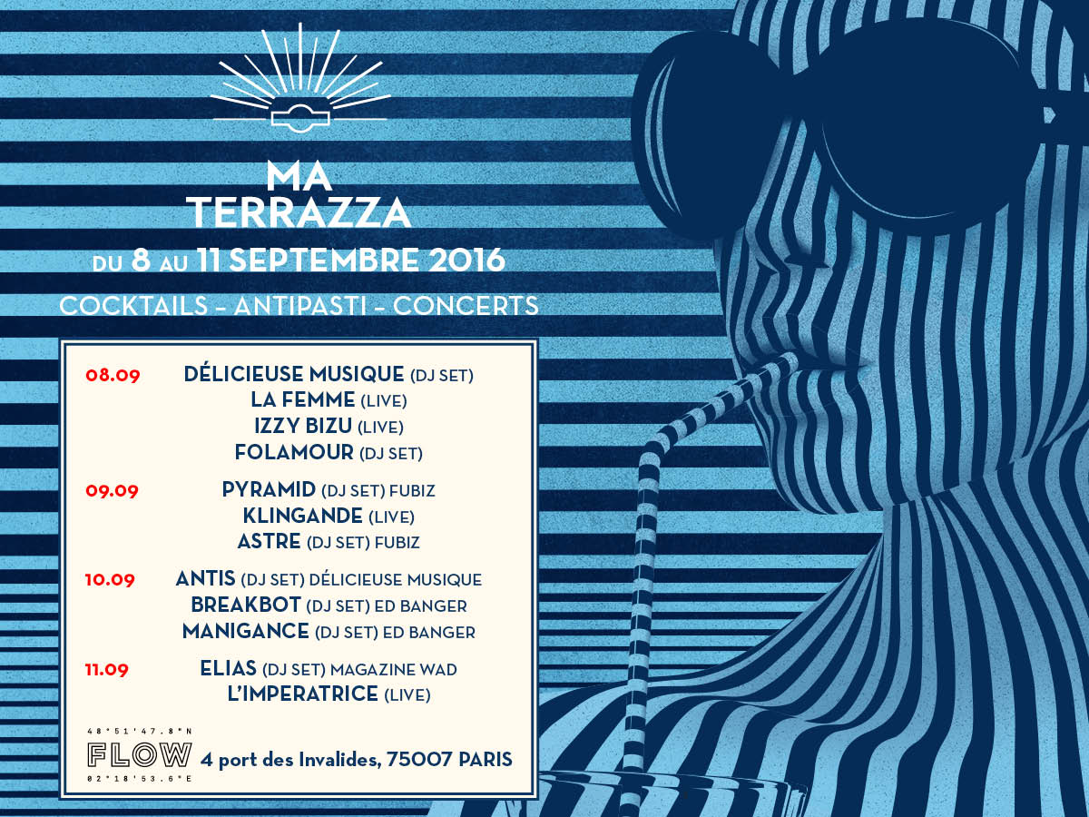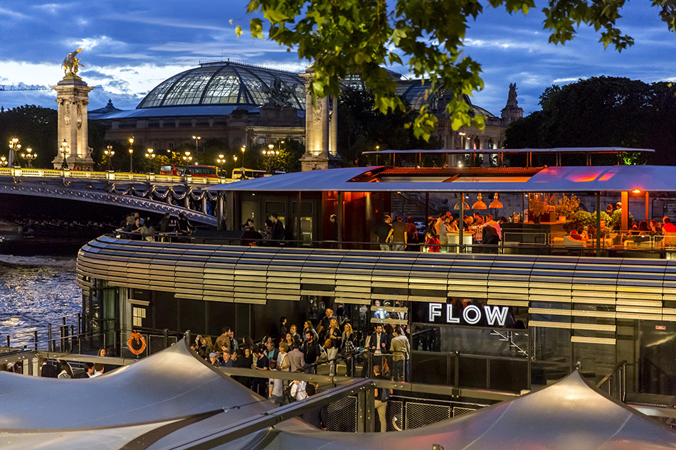 Pour ce rendez-vous immanquable, Ma Terrazza nous invite à bord du FLOW. Avec son rooftop et sa vue exceptionnelle sur le Pont Alexandre III et la tour Eiffel, cet objet flottant est le lieu de farniente et d'afterwork idéal. On y profite du soleil couchant au son des Dj sets et des lives, un verre de Martini e Tonic à la main…