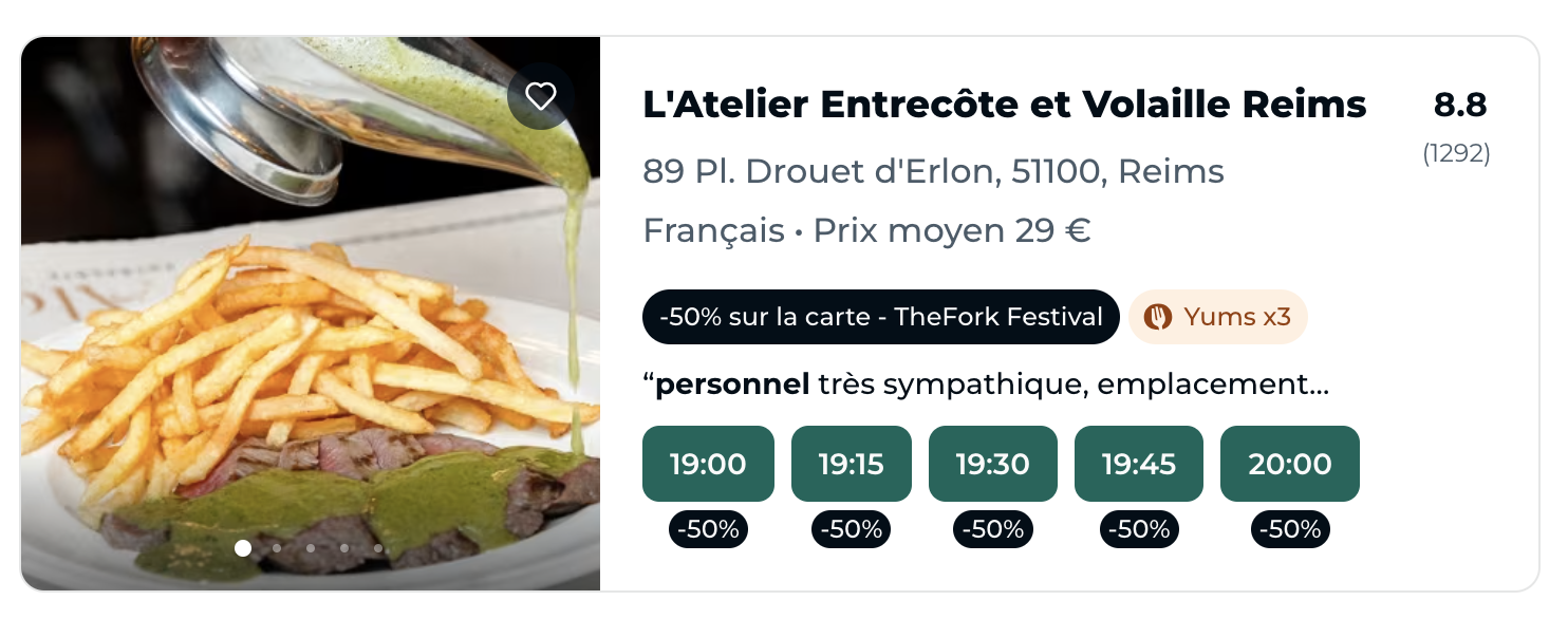 Plus de 1000 restaurants en France participent au Festival TheFork en 2025, et vous pouvez aussi en profiter à Reims ! À la clé ? -50 % sur la carte de ces 5 restaurants à tester :