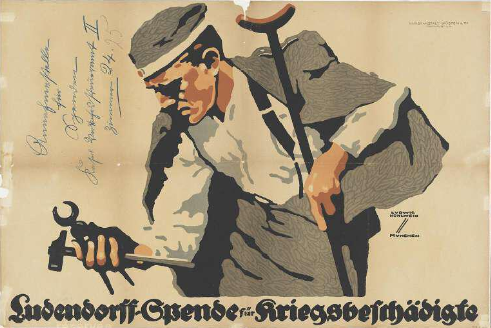 Explication des archives : Un mutilé, encore vêtu de son uniforme, essaie de saisir des outils dans sa main droite. Inscription manuscrite au crayon bleu : « Réception des dons à l'office II de la taxe de circulation impériale, bureau 24. »