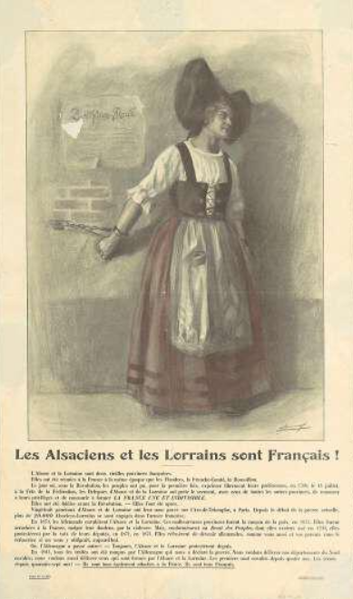 À la fin de la guerre franco-allemande de 1871, l'Alsace et la Lorraine sont annexées à l'Empire allemand. Lors de la Première Guerre mondiale, les Français veulent récupérer leurs territoires et l'Alsacienne enchaînée sur l'affiche personnifie l'annexion. En 1919, l'Allemagne cède l'Alsace et la Lorraine à la France.